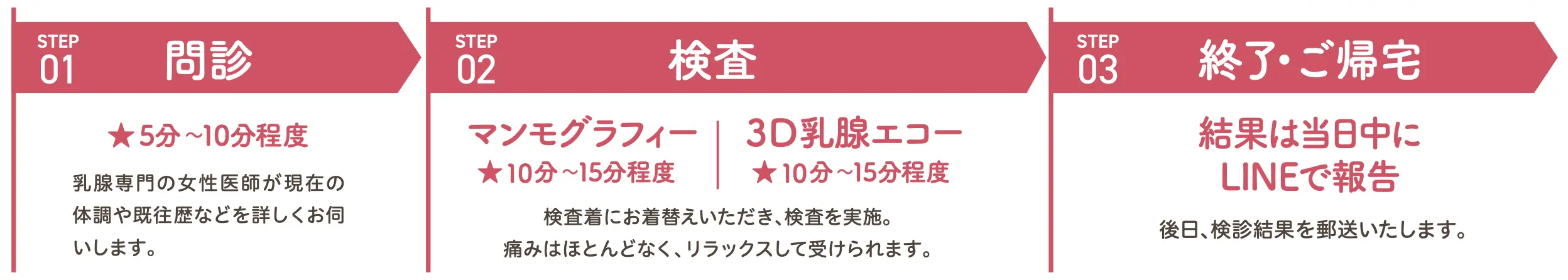 (クイック乳がん検診導入当初は諸事情により30分を超える場合もあるかと思います。ご不便、ご迷惑をお掛けしますが、どうぞ、ご理解のほどお願い申し上げます。)